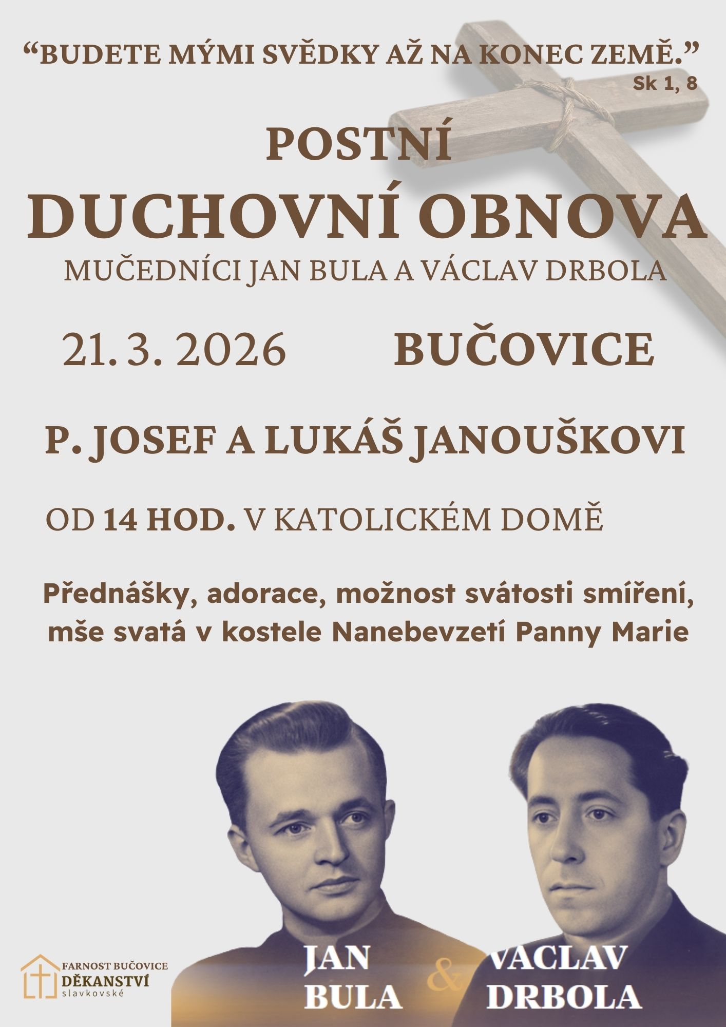 Přednáška, adorace, možnost svátosti smíření a mše svatá v kostele Nanebevzetí Panny Marie - to vše je na programu postní duchovní obnovy v Bučovicích, mimo jiné jednom z kněžských působišť Václava Drboly. Duchovní obnovou v místním Katolickém domě provázejí bratři Josef a Lukáš Janouškovi, autoři textů pro pobožnost křížové cesty zaměřenými na naše budoucí blahořečené.